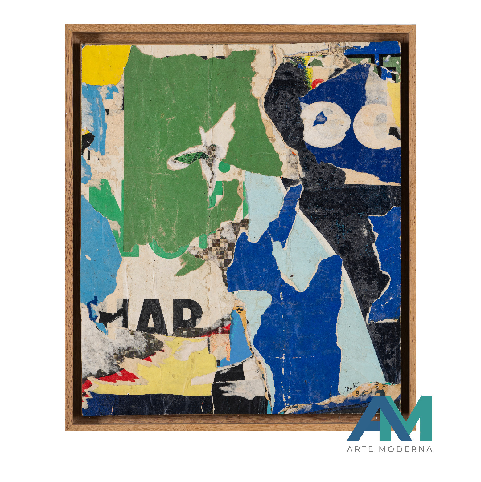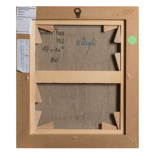 The work is a décollage applied on canvas, an emblematic technique of Nouveau Réalisme, in this work fragments of advertising posters torn from the streets of Paris are recomposed on the canvas, giving life to a layered and dynamic surface.