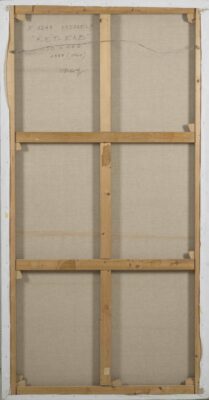 The work presented here, created in 1987 but derived from a project of 1960, testifies to the coherence and continuity of his research, the acrylic on canvas, in a large vertical format (inch. 74 ¼ x 38 ¾), is structured into two distinct yet complementary fields: in the upper half white vertical lines dominate against an intense blue background; in the lower part the lines are arranged horizontally, maintaining the same graphic tension, this orthogonal opposition generates a dynamic balance that actively engages the viewer’s gaze.