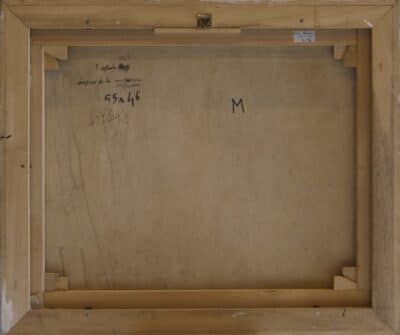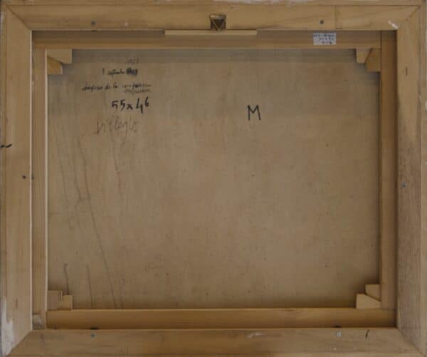 Opera in ottime condizioni, firmata sul fronte in basso a destra, sulla tela al retro ci sono la data e l’anno, il titolo, le misure, la firma e il codice di Archiviazione.